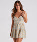 You'll be unforgettable in this short skater dress perfect for twirling into baby showers, brunches, and family parties! Featuring a sleeveless plunge v-neckline, spaghetti straps that cross and tie along the open back, and a fit-and-flare silhouette. The dress is composed of airy printed chiffon fabric with a smooth woven lining. Style with strappy mules and a clutch!Â