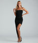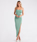 A real showstopper of a maxi dress! Flaunt your best self in this sleeveless dress featuring a square neckline, spaghetti straps, an open lace-up back design, a ruched side seam, and a bodycon silhouette with a flattering high side asymmetrical slit on sleek knit fabric. Complete the look in block heels for a dinner date.