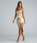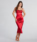 Look and feel effortlessly elegant in the Alena formal satin dress designed to make a statement! Crafted from luxuriously silky satin fabric, this timeless midi-length dress features a sweetheart cowl neckline, adjustable spaghetti straps, a padded bust, flexible boning inserts along the waist, and a bodycon silhouette with a flirty front slit. Complete the look in stiletto heels for a wedding guest or black tie party!
