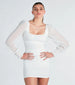 Make the night all about you in this alluringly chic mini dress! It features a square neckline, ruffled shoulder accents, long sheer chiffon peasant sleeves with smocked hems, a mesh bodycon silhouette with ruched detailing down the sides, and a mini-length hem. Style this mini dress with strappy stilettos.