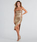 Stylishly turn heads like the alluring muse you are in this metallic midi dress! It features a sleeveless square neckline, spaghetti straps, an asymmetric mid-length hem creating a sultry thigh-high side slit, and a form-hugging silhouette. The textured metallic knit fabric will give off the most stunning sheen to make sure all eyes are on you. Complete your party 'fit with sparkly rhinestone heels.