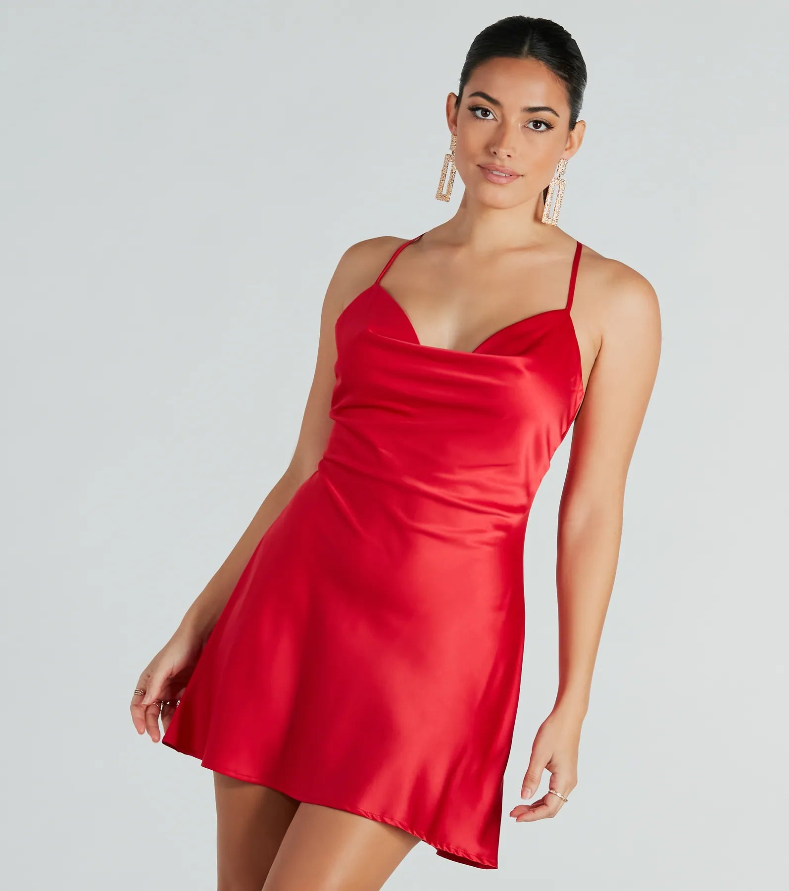 Oh-so-alluring and romantic will be your vibe in this sleek satin mini dress! Crafted from a silky lightweight satin fabric, this mini-length dress features a sleeveless cowl neckline, spaghetti straps, and an open back with a cross-back strappy design with a tie closure for an adjustable fit, and a flirty, flowy A-line silhouette. Style with gold hoops and rhinestone heels for a dressy date night.