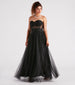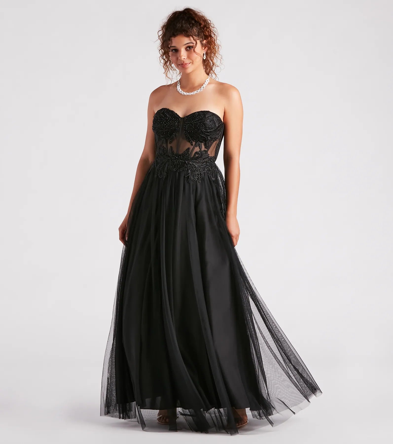 Enchant them all with your gorgeous allure in the Alora ball gown sure to bring the drama to prom, galas, or any soiree! She features a strapless sweetheart neckline with lined and padded cups, a sheer mesh bodice with flexible boning to give the illusion of a corset design, intricate floral embroidered applique with sparkling iridescent rhinestone embellishments, and a lace-up back for a customized fit. Her fitted high waist flows out to a floor-sweeping hem with a bold ball gown silhouette and tulle in the lining to add some flair. The sheer mesh and tulle fabric include a woven skirt lining. Complete your regal look with clear heels.