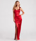 Show up looking luxe and lavish in the Amora ruched satin high slit formal dress! She features a sleeveless V-neck and back design, wide tank shoulder straps, princess seams, a high waist seam, lower back ruching, a floor-length hem with a thigh-high side slit, and a slim-fit silhouette. The satin-knit fabric will give off a stunning sheen. Style this long dress with a pair of strappy stilettos.
