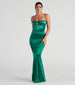 Dazzling rhinestone trim heats up the Analynn formal satin dress for your next black tie gala or wedding! She features a sleeveless scoop neck with a flirty twist and keyhole accent, adjustable spaghetti straps to customize her fit, and an empire waist seam. Her form-hugging mermaid silhouette gently flares out into the floor-length hem that elongates your figure! The formal dress is composed of silky satin fabric with a sewn-in lining and minimal stretch. Complete your dressy look with a chic rhinestone clutch and bracelet.