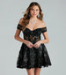 Catch light and attention in the Anita sequin party dress at homecoming or birthday celebrations! She features an off-the-shoulder, sweetheart neckline adorned with sheer short-sleeve cuffs, a padded bust, a sheer corset mesh bodice with flexible boning, and a flirty skater silhouette and short-length hem. The formal party dress is designed with a striking sequin-embellished scroll pattern on airy mesh fabric and has multiple satin and tulle linings for a voluminous effect. Complete the look with earrings and lace-up heels.