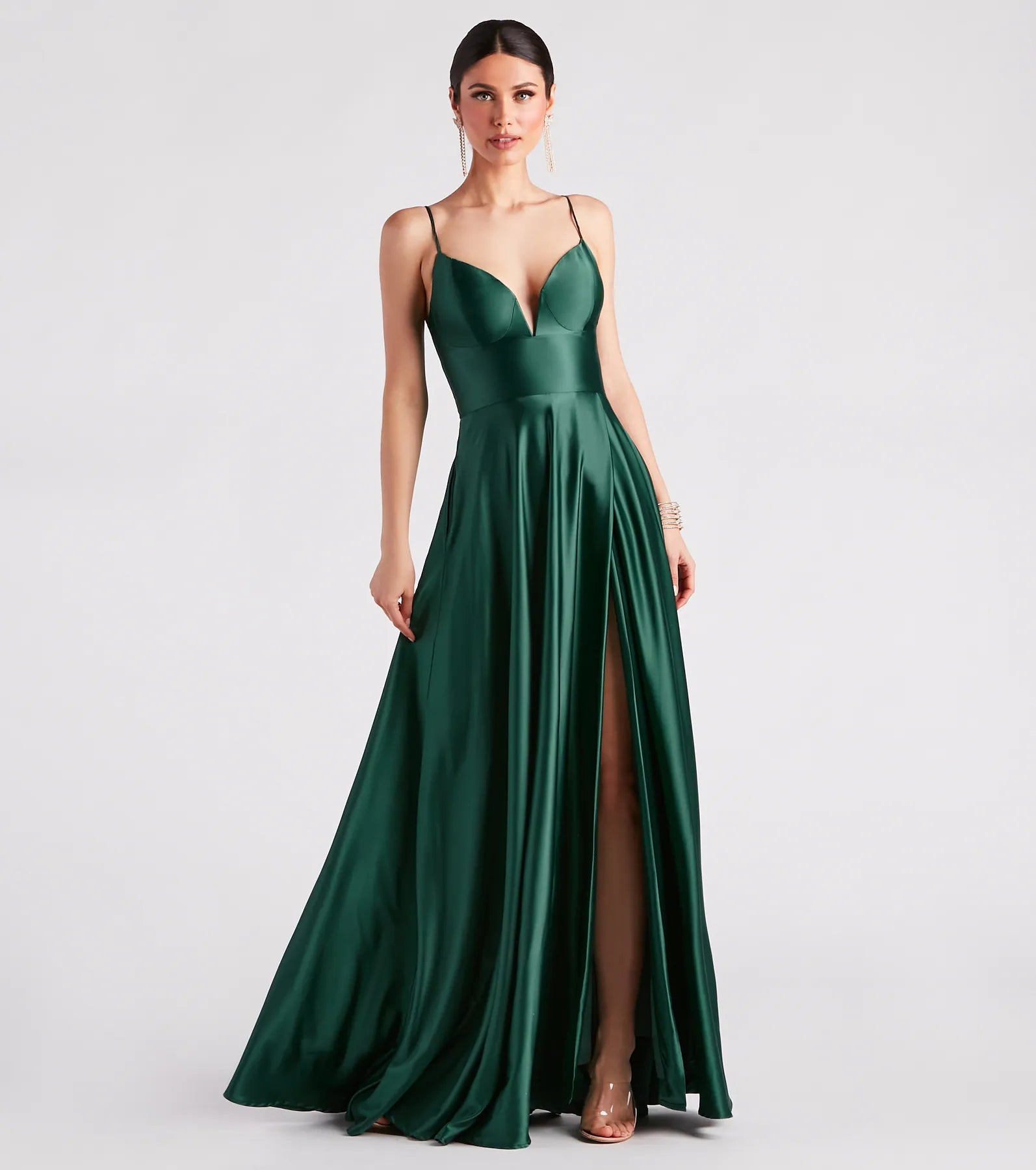 Sophisticated and oh-so-sleek, the Anya satin formal dress will leave them speechless! She features a sleeveless V-neckline with a structured bust, adjustable spaghetti straps for a customized fit, dual high waist seams, a floor-sweeping hem with chic pleating, a wrap-front design creating a high slit, and a flowy A-line silhouette. The luxe satin woven fabric will give off a stunning sheen. Complete the look with rhinestone chandelier earrings for your next gala.
