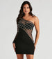 Sparkle up the room in the stunning Arianna formal mini dress that brings the glitz and glamour! She features an asymmetrical one-shoulder neckline with a single sheer long-fitted sleeve, a sheer unlined mesh top with an asymmetrical cut design, iridescent rhinestone embellishments in a woven pattern, and a short crepe bodycon skirt. The mesh and crepe fabrics offer a moderate stretch. Complete your luxe look with strappy heels for a night out.