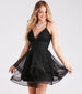 The party-perfect Astrid mesh skater dress pairs well with crowns and selfies! She features a sleeveless V-neckline, adjustable spaghetti straps that cross in the back, a pleated and padded bust, a pleated high waist with flexible boning inserts for a snatched look, and a flattering skater silhouette with a ruffled bonded short-length hem. The party dress is composed of a mesh fabric with a stretchy knit lining. Complete the look in a pair of glamorous heels for a school dance or banquet!