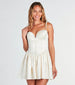Be a luxe sensation in the Aubrey bustier skater dress as the stunning bride-to-be, birthday cutie, or guest! She features a wired sweetheart neckline and padded bust with seam detail to enhance your look, while the faux pearl embellished adjustable straps add a touch of elegance. Made with flexible boning inserts and a drop waist seam to showcase your femme figure along the short skater silhouette. The skater dress is crafted of a chic textured woven fabric with a full stretchy knit lining. Complete the look in sassy stiletto pumps for a bridal shower or birthday!