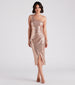 Get some compliments when you stun in the Ava formal sequin dress for upcoming cocktail mixers or art show galas! She radiates shine and a classic style in her sleeveless, one-shoulder neckline, tank-style strap, high-waist seam, and form-hugging asymmetrical wrap slit midi-length hem. The formal dress is composed of a sequin patterned fabric with a sewn-in knit lining and moderate stretch. Style with sleek block heels to complete the look!Â