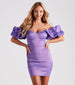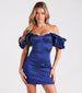The Azalai satin short dress brings flirty allure with voluminous fun! She features an off-the-shoulder, sweetheart neckline with non-slip grip lining, ruffled elasticized sleeve cuffs, a padded bust, and a form-hugging short-length hem. The formal mini dress is composed of a metallic-like taffeta woven fabric with minimal stretch and a lined bust. Style with stiletto heels and a clutch to complete the look!Â