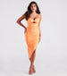 Sound the alarm in this alluring bodycon midi dress! It features a sleeveless sweetheart neckline with a built-in padded bust and a twist-front design, a small keyhole cutout under the bust, spaghetti straps, ruching down the midi-length silhouette, an asymmetric hem creating a high side slit, and a curve-hugging fit. The smooth knit fabric offers plenty of stretch. Style with platform heels for your next night out.