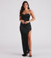Amp up the sultriness of your formal look with the sleek and stunning Bailey satin dress! She features a sleeveless cowl neckline with layered pleated detailing, rhinestone embellished chain-link shoulder straps that are removable to make the dress strapless, a fitted empire waist, a curve-hugging silhouette, and an asymmetric floor-length hem creating an ultra-high side slit. The smooth satin-knit fabric offers a moderate stretch. Style with rhinestone fringe earrings for your next fancy soiree.