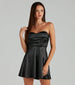 Show up ready to swoon every heart in this satin skater dress at parties! It features a strapless sweetheart neckline with non-slip grip lining, a pleated bust overlay, an eye-catching strappy lace-up back, and a short-length hem. Complete the look with a rhinestone choker and earrings!