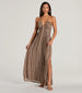 Channel a bohemian chic vibe with this breezy halter maxi dress perfect for summer. The lightweight woven fabric showcases a geometric striped print in stylish neutral hues. The long dress features a sleeveless plunging V-neckline, halter spaghetti straps that can be crossed in the front for a trendy look, and a tie-back design at the neck. The alluring open back leads to lower tie-back straps and a lower cutout accent. You'll love the hidden side pockets and high side slit on the effortless, flowy silhouette. Complete the look with strappy sandals.
