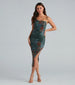 Dreamy boho and chic come together on this paisley print mesh midi dress you'll love for wine nights with bae! It features a cowl neckline adorned with a shoulder strap and bungee spaghetti strap, a flattering bodycon silhouette, and a side ruched seam atop a slit and asymmetrical hem. Complete the look with strappy heels and earrings.
