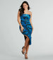 Dare to be bold at your next formal party in this alluring ruched floral mesh midi dress! Designed with an abstract floral print on the airy sheer mesh fabric with a full-length lining, this chic dress will steal all the glances. The strapless straight-across neckline shapes the fitted bodice, and the flexible boning provides structure. The back and side seams are accented with ruched detailing to accentuate your gorgeous curves on the bodycon silhouette. You can show off some leg with the high-cut side slit that adds that sultry touch. Style this mid-length dress with stiletto heels.
