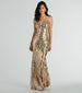 The enchanting Brie formal long dress evokes old Hollywood glamour! She features a plunge V-wired neckline, a padded bust, adjustable spaghetti straps, and a mermaid silhouette that gracefully flows into her floor-length hem. The formal long dress is designed with a luxurious sequin leaf pattern embellished mesh fabric with a stretchy knit lining. Complete the look with a clutch for a gala or black tie holiday event!