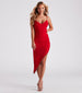 Captivate the crowd in this crepe midi dress showcasing luxe details sure to impress! It features a sleeveless v-neckline, spaghetti straps, a bodycon silhouette, side ruched seam leading to the asymmetrical, side cutout hem with rhinestone trim. Style with hoop earrings and heels to complete the look!Â