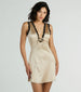 Even in the most crowded room, you'll be captivating in this satin dress on your next evening out! This delicate and femme dress boasts a romantic plunge V-neckline with lace trim and bust tie while the flattering A-line silhouette and short-length hem show off your curves. Complete the look in stiletto heels and a purse!