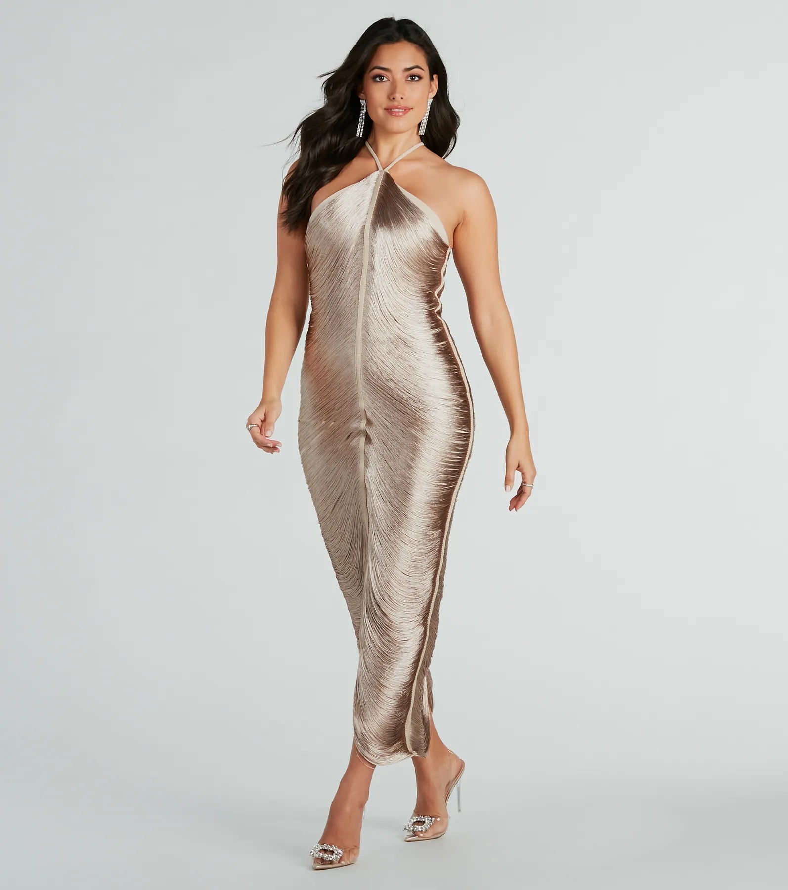 Old Hollywood with flapper flair, the Carolina formal fringe maxi dress sways with every move you make! She brings modern glamour with her sleeveless high neckline, spaghetti halter straps, a form-hugging silhouette, and a curved long-length hem. The formal maxi dress is designed with fringe detailing throughout a smooth knit fabric that enhances your curves and adds some drama to the night. Complete the look with rhinestone PVC pumps for a cocktail party or banquet!