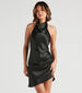 Sleek and simple, the Caroline satin mini dress is the perfect option for a fancy dinner date. She features a sleeveless halter neckline with a subtle draped front, an alluring backless design, pleated detailing at the waist, and a short, flowy, A-line silhouette. The woven satin fabric includes a lightweight lining. Style this timeless dress with lace-up heels.