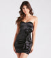A sweet pick for upcoming weddings and fancy soirees! The Carrie satin party mini dress features a classic strapless sweetheart neckline with non-slip grip lining, a padded bust, and a front statement rose with cascading ruffle, a bodycon silhouette, and a flirty mini-length hem. She's composed of a smooth silky satin fabric with moderate stretch. Complete the look with fluttery faux lashes for a doll vibe!