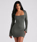 This ribbed knit mini dress will create perfect casual 'fits! It features a square neckline, long fitted bell sleeves with cute flared-out hems, and a mini-length, form-hugging silhouette. The lined knit fabric offers plenty of stretch for comfortable wear. Style with knee-high boots.