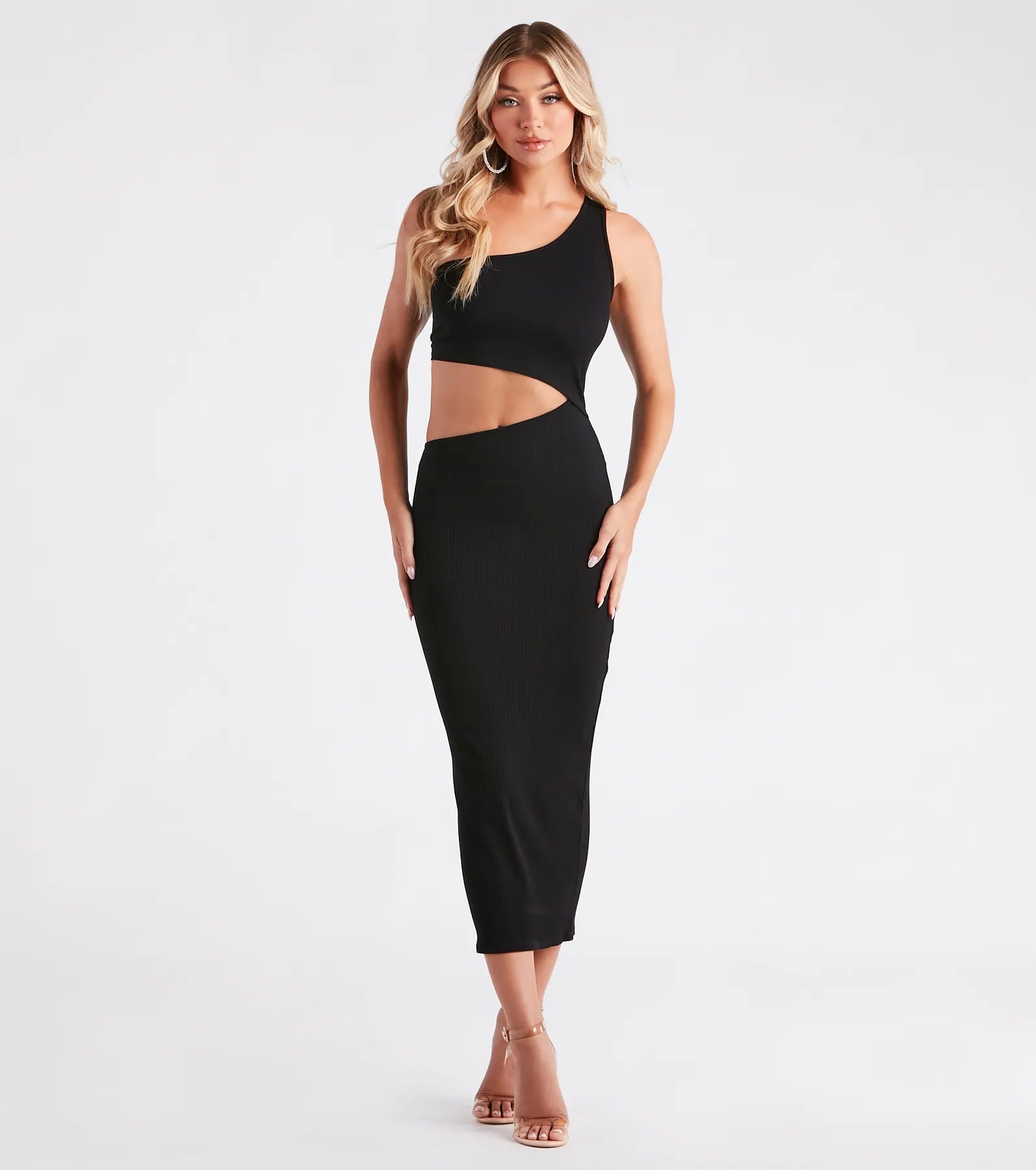 This sultry-chic midi dress will level up your look and make you a casual style icon! It features a sleeveless asymmetric one-shoulder neckline with a tank strap, a bold asymmetric waist cutout for a hint of skin, a midi-length hem, and a bodycon silhouette that will hug your curves. The ribbed knit fabric offers plenty of stretch. Pair with clear mules.