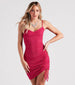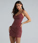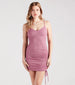Mesmerize everyone at the club in this glitter mini dress designed to catch the dance floor lights! It features a sleeveless V-neckline with spaghetti straps, a bodycon silhouette, and a side front ruched drawstring so you can customize the fit. The lined glitter knit fabric offers a moderate stretch. Complete the look with chic mules.