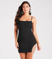 It's your chance to shine! Slip into this chic crepe mini dress featuring a sleeveless square neckline, adjustable spaghetti straps, a bodycon silhouette, and a mini-length hem with a side slit accent with a sparkly rhinestone fringe trim. The lined crepe fabric offers a moderate stretch. Complete your dressy look in this mini dress with nubuck heels.