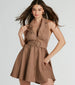 Charm them all with your chic style in this sleeveless collared skater dress! Designed with a lightweight woven fabric, this short dress features a collared V-neckline and a flirty open back. The button-front design goes down the complete length of the dress for effortless styling. The high waist is accented with a wide belt for a cinched look, leading to the fit and flare skater silhouette. Complete the look for a spring party with clear heels.