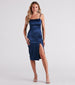 Make your next cocktail party a chic affair with this sleek satin midi dress. It features a sleeveless square neckline, spaghetti straps, an alluring open back with a bar strap accent, a lower back ruched knot detail, a midi-length hem with a high front slit, and a form-hugging silhouette. The satin-knit fabric offers a moderate stretch. Complete your look with rhinestone heels.
