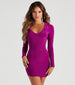 Showcase your silhouette in this chic bodycon mini dress! It features a V-neckline, long fitted sleeves, ruched detailing at the shoulders, a mini-length hem, and a curve-hugging fit. The smooth knit fabric offers plenty of stretch. Style with clear lucite heels.