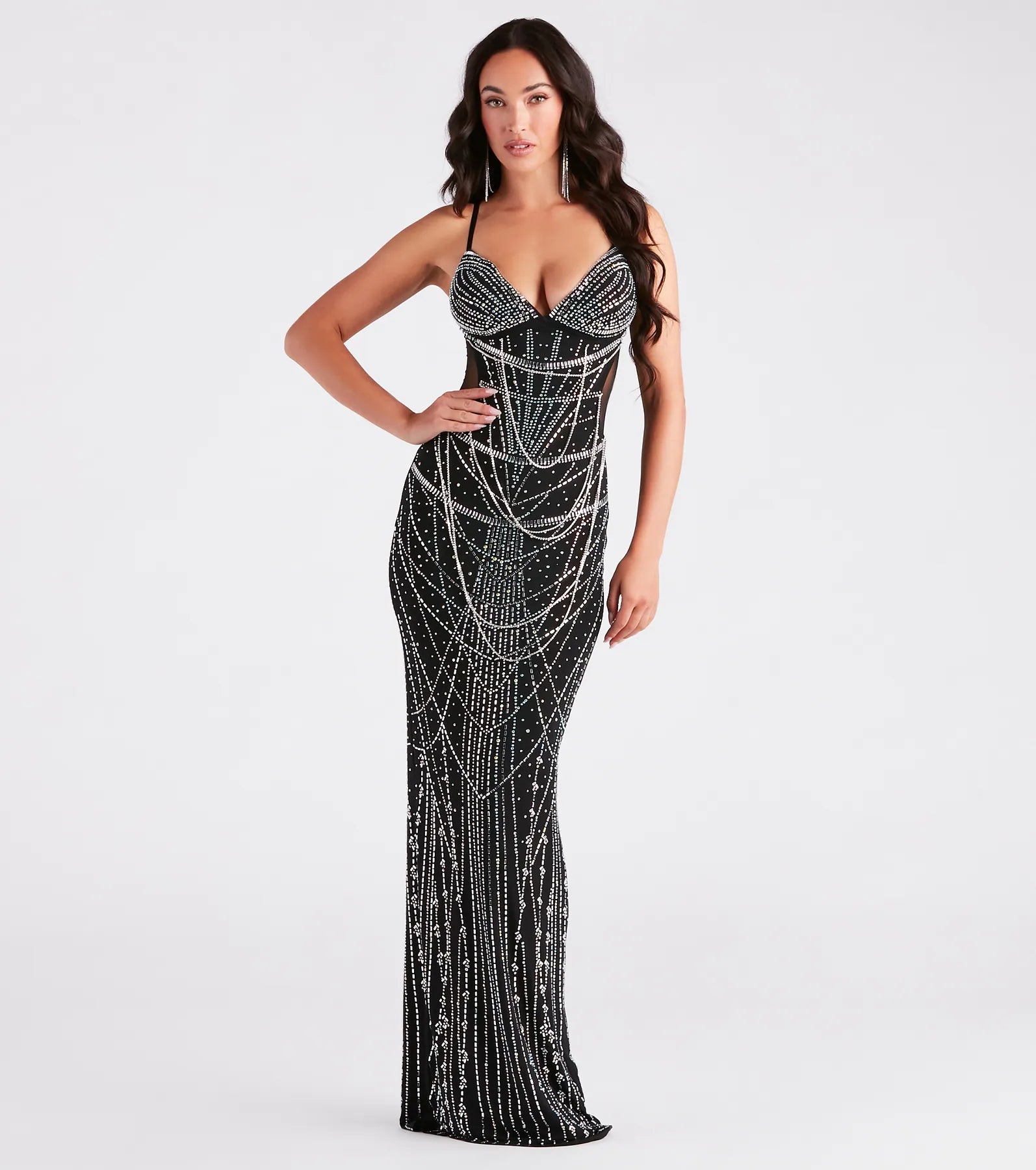 You'll be draped in luxe shine with the sparkling rhinestone embellishments of the Ciara formal dress! She features a sleeveless sweetheart neckline with a built-in padded bust, adjustable spaghetti straps for a customized fit, and a back zipper and hook and eye closure. Her sheer mesh panels on each side of the waist create an hourglass illusion, leading to a floor-sweeping hem with a back slit accent and a slim-fit silhouette. She features iridescent rhinestone embellishments in an intricate pattern cascading down the length of the dress, and she has a stunning rhinestone front draped design. The sheer mesh fabric includes a partial knit lining. You'll be the best dressed at your fancy soiree in this gorgeous style with rhinestone fringe earrings.