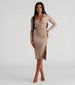 This soft ribbed knit midi dress is perfect for fall coffee dates! It features a collared V-neckline, long fitted sleeves, a partial faux button-down front, a midi-length hem with a high front slit, and a form-hugging fit. Style with knee-high boots for a chic autumn look.