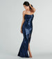 The Colette formal sequin mermaid dress will bring the glamorous drama to your black-tie affair! Crafted with all-over glitzy sequin embroidery for a gorgeous sheen, she features a strapless sweetheart neckline with a cowl-draped overlay, a high waist seam, ruching at the waist, a chic asymmetric front seam leading to a high-cut front slit for an alluring flair, and a floor-sweeping hem with a mermaid silhouette. The sheer mesh fabric includes a full-length knit lining. Complete your formal look in this long dress with a rhinestone jewelry set.