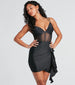 Show off your curves in this mini dress to make a lasting impression! The mini-length dress features a V-neckline, a padded bust, dual adjustable spaghetti straps, a sheer mesh bodice with trim, a flattering bodycon silhouette, a wrap hem, and an eye-catching cascading ruffle down the front. Complete the look in rhinestone earrings for a night out!
