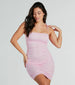 Create the cutest look for your weekend plans in this floral ruched knit mini dress! The adorable ditsy floral print on the soft and stretchy brushed knit fabric will give your casual look a flirtatious vibe! The short dress features a sleeveless square neckline with tie-shoulder spaghetti straps for a trendy detail and customized fit. The ruching down the side seams will show off your curves on the bodycon silhouette. Style this dress with hoop earrings and strappy mules for brunch with your girls!