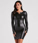 You'll be on the cutting edge of style with this faux leather mini dress in your arsenal! It features long fitted sleeves with cool thumb holes, a crew neck, an exposed front zipper closure, and a bodycon silhouette. Complete the look in lace-up heels.