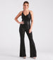 This sparkling sequin jumpsuit is worthy of a dance floor diva like you! It features a sleeveless cowl neckline, halter spaghetti straps, an alluring backless design, a high waist seam, a hip-hugging fit, a form-hugging fit throughout the leg, and a fab flared hem. The mesh fabric features all-over sequin embroidery for a gorgeous shine under the lights. Style with rhinestone fringe earrings and platform heels.Â