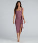 Dare to be noticed in this effortless midi dress perfect for dressy soirees and dates! Capture the moment in this knee-length dress featuring a square neckline, adjustable spaghetti straps, a cascading front ruffle trim, a flattering bodycon silhouette, and a sultry side slit on slinky knit fabric. Complete the look in block heels and a clutch.