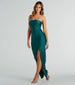 Made from shimmery knit fabric, the Darianka formal long dress delivers subtle glamour perfect for bridesmaids, wedding guests, or fancy parties! She features a strapless neckline, a padded bust for support, a side pleated, and a figure-flattering slim silhouette with a wrap-high front slit. Complete the look with a chic clutch and heels.