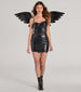 Serve major sultry looks this Halloween as a dark angel in this sleek faux leather mini dress! It features a corset bodice with a sweetheart neckline and an angled lace-up design, adjustable spaghetti straps for a customized fit, and a bodycon silhouette to flaunt your curves. Complete your costume with the matching wings, fishnet tights, and earrings.