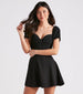 You'll look so darling in this skater dress at your next dressy event! It features sheer puff sleeves, a sweetheart neck, padded bust. mesh-lined bodice with piping, and a fit and flare crepe skirt. Complete the look in bow heels for a flirty style!