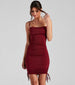 This trendy ruched mini dress is perfect for transitioning from day to night! It features a sleeveless cowl neckline, spaghetti straps, ruching down the side seams, adjustable drawstrings at the hem, and a short, curve-hugging silhouette. Style with a duster and mules for the day, and a faux leather jacket and stilettos for the night.