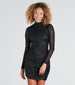 Dazzle like a star in this sequin mini dress to make your grand debut at parties! The mini-length dress features sheer fitted long sleeves, a mock neckline, and a sexy ruched bodycon silhouette that flaunts your figure on sequin embroidered knit fabric. Complete the look in sparkling block heels.