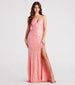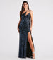 Light up the room in the Debbie formal long dress covered in sparkling sequins to make your grand debut at the dance or a gala! She features a sleeveless one-shoulder with a flirty cutout, adjustable spaghetti straps, a lightly padded bust, and a curve-hugging mermaid silhouette with a sultry slit along her floor-length hem. The formal dress is composed of a sequin-pattern mesh fabric with a stretchy knit lining. Complete the look with a gorgeous necklace and bracelet.