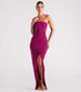 Chic with a sultry style, the Demi formal dress will level up your look for weddings, parties, or any fancy affair. She features a sleeveless asymmetric one-shoulder neckline, a thin tank shoulder strap, a high waist seam, ruched detailing down one side seam, a floor-length hem with a wrap-front design creating a sexy thigh-high slit, and a curve-hugging silhouette. Style with rhinestone fringe earrings and metallic heels.